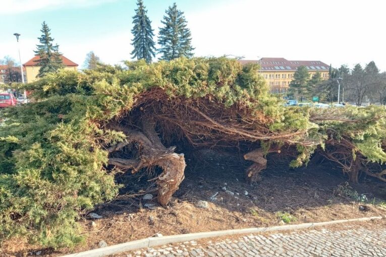 Zelený pás před budovou dnes tvoří především přestárlé jalovce, které se za roky nekontrolovaně rozrostly. Zasahují do chodníků i prostoru laviček a jejich pravidelný ořez zanechává suché, nevzhledné pahýly. Výsledkem je zanedbaný dojem v místě, které přitom denně míjejí stovky lidí.