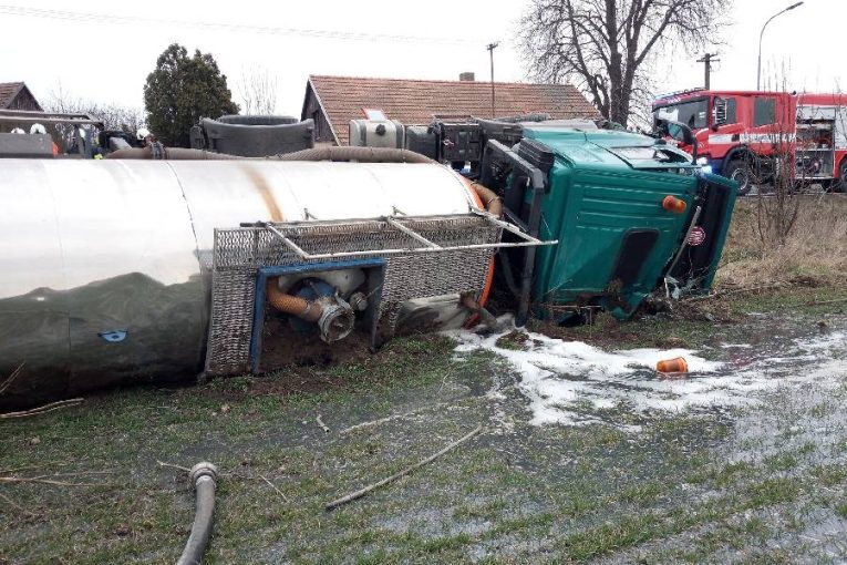 Cisterna se převrátila na bok a zůstala ležet v poli