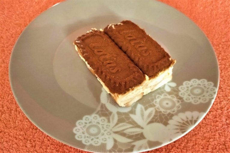 V receptu je použitý pekáček o rozměrech 34 x 23 cm, na který vystačí 6 x 4 Lotus sušenek, asi 2/3 jednoho balení. Formu vyložíme pečicím papírem a na něj naskládáme, těsně vedle sebe, první vrstvu piškotů. Následně navrstvíme krém a položíme druhou vrstvu piškotů, které opět potíráme krémem. Jako poslední vrstvu naskládáme sušenky Lotus. Dodají celému zákusku výbornou karamelovou příchuť. Zákusek dáme uležet do chladu na cca 24 hodin.