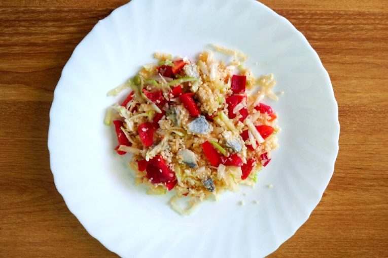 Celer nastrouháme nahrubo, šťavnatou mladou cuketu a papriku nakrájíme na malé kousky. Přidáme rovněž na kousky nakrájené nakládané ryby, a to včetně kořeněného oleje. Právě ten dodá celému pokrmu tu správnou chuť. Nakonec vmícháme potřebné množství tepelně upraveného kuskusu. Kuskus není potřeba vařit, stačí jej jen zalít horkou vodou v poměru 2:3 (tj. na 2 díly kuskusu, 3 díly vody). Množství a poměr ingrediencí zvolte dle své chuti, a podle toho, co doma naleznete. Fantazii se meze nekladou.