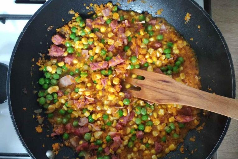 Na oleji zpěníme cibulku, přidáme najemno nakrájenou pikantní klobásku a orestujeme. Až cibule zezlátne a klobáska pustí šťávu, přidáme najemno nastrouhanou či nakrájenou mrkev, mražený hrášek a mírně podlijeme. (Pokud použijeme čerstvý hrášek, přidáme jej až později, protože potřebuje kratší dobu tepelné úpravy než hrášek mražený.) Osolíme a okořeníme. Dusíme, až zelenina změkne, a dle potřeby dochutíme. Je-li zeleninová směs příliš řídká, zahustíme. K tomu můžeme použít trochu hladké mouky rozmíchané v malém množství studené vody, kterou vmícháme do pokrmu. Klasicky se používá pšeničná mouka pro vysoký obsah lepku, ale kdo chce jíst zdravěji, může použít i jiné druhy mouky, případně rozmixované ovesné vločky. Dušenou mrkev můžeme podávat s vařeným vejcem jako hlavní chod nebo menší porci jako večerní jídlo.