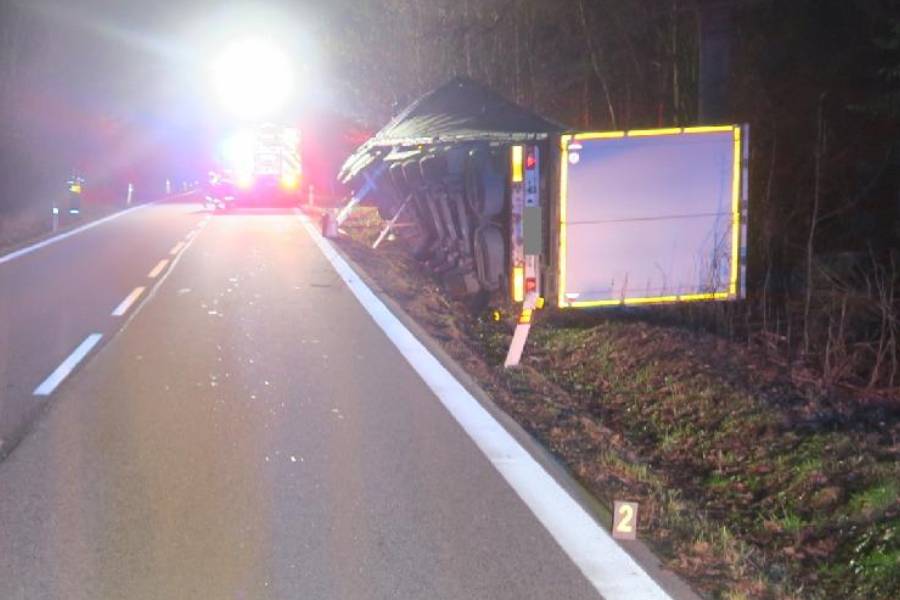 K nehodě došlo v pondělí 4. března v deset hodin večer na silnici I/23 ve směru z Telče na Třebíč. „Řidič se za jízdy zřejmě plně nevěnoval řízení vozidla a následně sjel s jízdní soupravou z vozovky vpravo na zpevněnou krajnici, následně na nezpevněnou krajnici a travnatý pás, kde s jízdní soupravou havaroval na pravý bok,“ uvedla mluvčí policie Dana Čírtková.