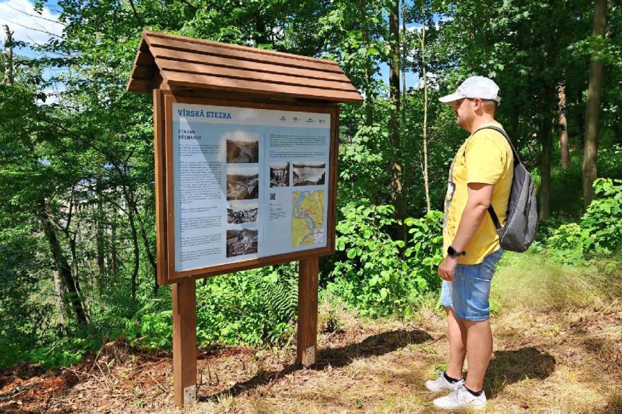 Nová stezka navazuje na červenou turistickou značku od vyhlídky Klubačice a Vírské skalky. Zaparkovat můžete přímo v areálu Továrny a poté se vydat vzhůru k přehradní hrázi a pokračovat na Klubačici. Stezku je možné využít i jako návratovou trasu z Jezerní ferraty. „U parkoviště v Továrně, kde je začátek, postupně vzniká odpočinková zóna s lavičkami, zelení a v budoucnu i vodním prvkem a různými zajímavostmi pro děti,“ doplňuje David Matuška.