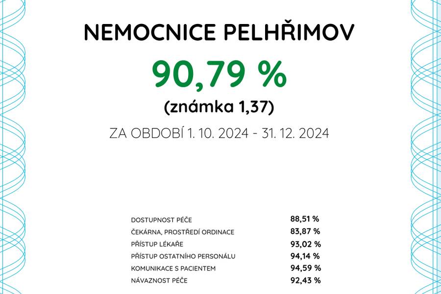Hodnocení probíhalo od 1. října do 31. prosince 2024 ve třiadvaceti ambulancích. V dotaznících, které pacienti anonymně vyplňovali, dosáhla nemocnice průměrné známky 1,37 (90,79 procent), což je oproti předchozímu hodnocení zlepšení o 2,12 procent.