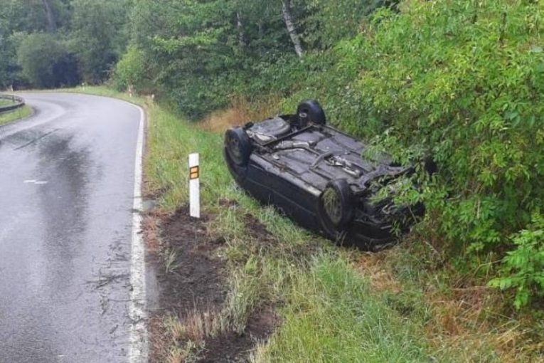 Nehoda u Nové Říše: Řidička dostala smyk na mokré vozovce a převrátila auto na střechu
