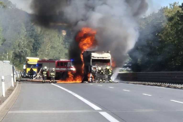 Na D1 vzplál kamion. Šokované řidičce pomáhali policisté, kteří jeli ze školení