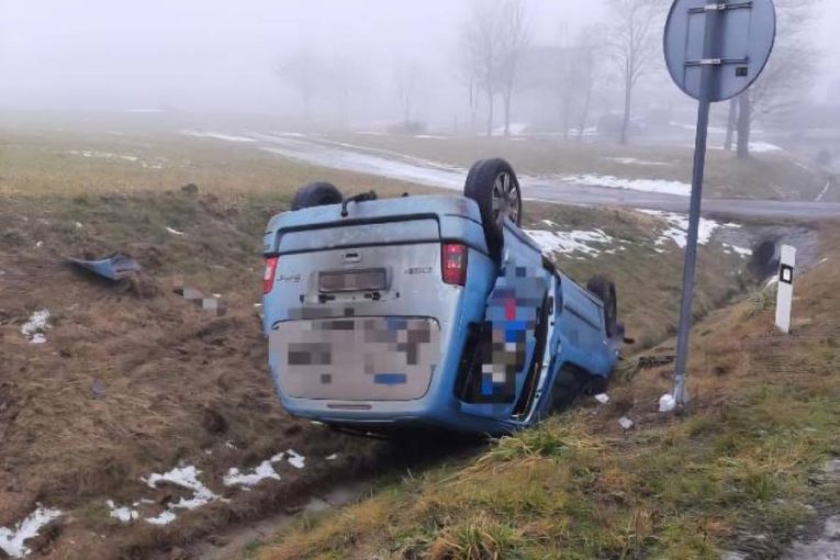 Řidič na Žďársku dostal na mokré silnici smyk. Auto skončilo na střeše