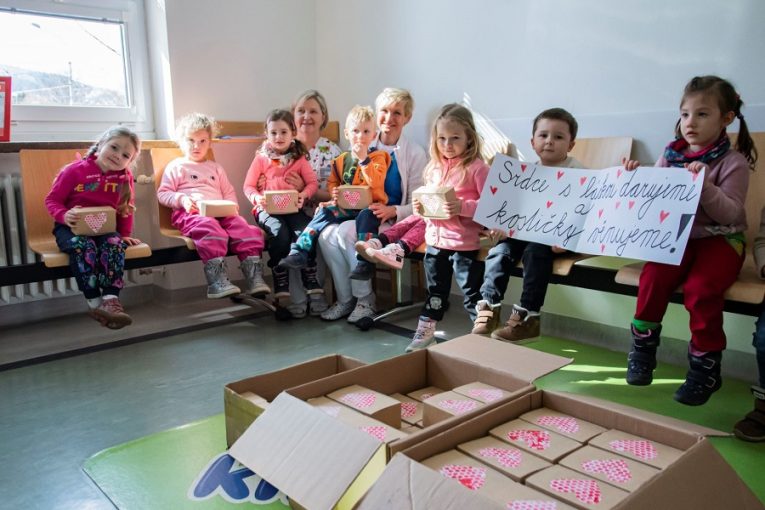 Myšlenkou projektu Srdce s láskou darované je darovat libovolné instituci cokoliv, co by potěšilo a vykouzlilo úsměv na rtech. Mateřská škola Budovatelská ve Zlíně se rozhodla ve spolupráci s chráněnou dílnou HelpSoul v Bystřici pod Hostýnem udělat radost dětem, které přicházejí do čekáren ambulancí. „Zaměstnanci chráněné dílny HelpSoul připravili 1 000 kusů obroušených dřevěných kostiček, na které naše děti z jedné strany nalepily obrázky – aby kostky sloužily jako pexeso – a z druhé namalovaly srdce. Udělali jsme 90 krabiček, v každé je celkem 12 kostek,“ popsala iniciátorka akce a učitelka Daniela Janoušková.