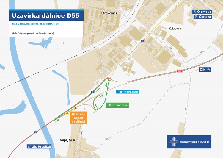 Uzavřen bude pouze nájezd ve směru z Uherského Hradiště a objízdná trasa povede po silnici I/55 na okružní křižovatku. Nájezd na dálnici D55 bude možný z Napajedel.