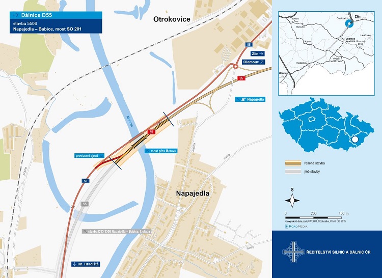 Stavba D55 Napajedla – Babice je rozdělena do tří etap. „První, která řeší napojení dálnice D55 na silnici I/55, již budujeme v rámci akce D55 Babice – Staré Město. Stavba mostu přes řeku Moravu je druhou etapou. Po dokončení mostu navážeme třetí etapou, což je 7,5 kilometru dlouhý dálniční úsek, který propojí dálniční most přes Moravu s aktuálně realizovanou dálnicí u Babic,“ popsala Trubelíková.