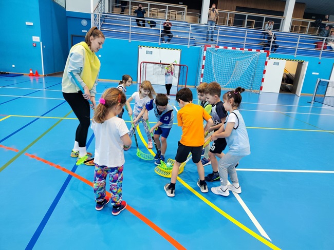 Předškoláci se jednou týdně sjíždí do městské sportovní haly, aby si vyzkoušeli nejrůznější disciplíny. V rámci ukázkového dopoledne dnes měli rodiče možnost pozorovat, jaké sporty se děti učí a zda od začátku roku udělaly pokrok ve svých dovednostech. Největší prostor v hale je věnován atletickým disciplínám, které rozvíjí pohybovou všestrannost a dávají základ také ostatním sportům. V dalších čtyřech sekcích se děti věnují tenisu, fotbalu, florbalu a gymnastickému aerobiku.