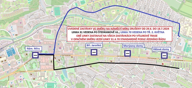 V období od 29. června do 18. července budou moci vozidla MHD projíždět po tř. T. Bati pouze ve směru od Městského divadla k nemocnici. V opačném směru do centra města nebude provoz MHD možný. Autobusy linky 31 z Jaroslavic pojedou do centra po ulici Štefánikově. Spoje linky 70 budou vedeny po tř. 2. května. Zastaví na všech zastávkách výlukových tras. Zastávky Bří Jaroňků, Morýsovy domy a Věžové domy směrem do centra Zlína nebudou v tomto období městskou dopravou obsluhovány.