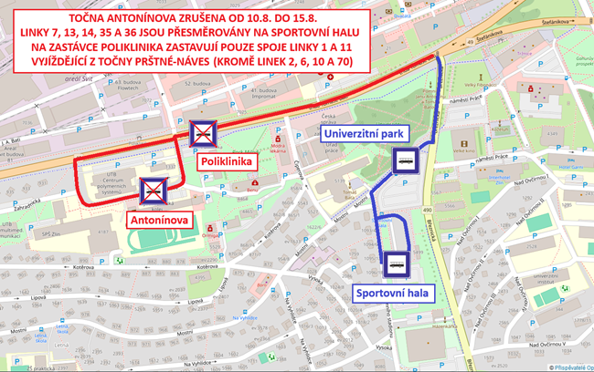 V období od 10. do 15. srpna nebudou moct vozidla MHD zajíždět na obratiště Antonínova. Týká se to linek č. 7, 13, 14, 35 a 36. Jejich trasy se v tomto období přesměrují na obratiště Sportovní hala, nebudou tedy zastavovat na zastávkách Antonínova ani Poliklinika.