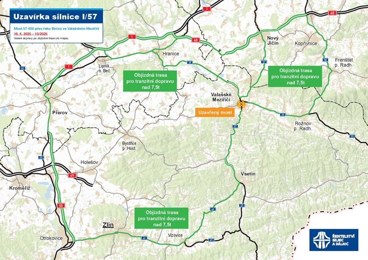 Řidiči vozidel nad 7,5 tuny musí počítat s objížďkou. Ta povede přes Vsetín, Vizovice, Zlín, Otrokovice, Přerov, Lipník nad Bečvou, Hranice, Nový Jičín, Příbor, Kopřivnici, Frenštát pod Radhoštěm a Rožnov pod Radhoštěm.