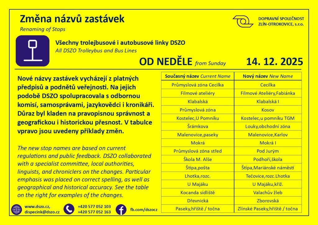 Hledání nových názvů pro vybrané zastávky MHD byl podle dopravního podniku poměrně dlouhý a sofistikovaný proces. „Při jejich formulování jsme vycházeli z platných předpisů a také z podnětů veřejnosti. Svá vyjádření k návrhům nám dávala odborná názvoslovná komise města Zlína, dotčené samosprávy a jejich místní části, jazykovědci i kronikáři,“ přiblížil vedoucí dispečer Jan Tesař, který se společně s Jakubem Holubcem a dalšími kolegy z DSZO touto problematikou zabýval.