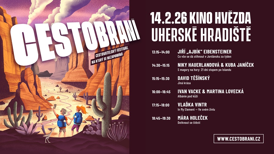 Cesta kolem světa v průběhu jediného dne aneb Cestobraní 2026 vypukne v sobotu 14. února od 13 hodin v kině Hvězda v Uherském Hradišti. Akci pořádá spolek Mysli Jinak a Městská kina Uherské Hradiště.