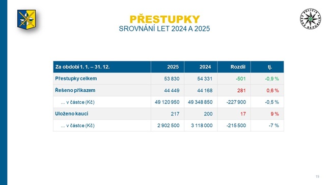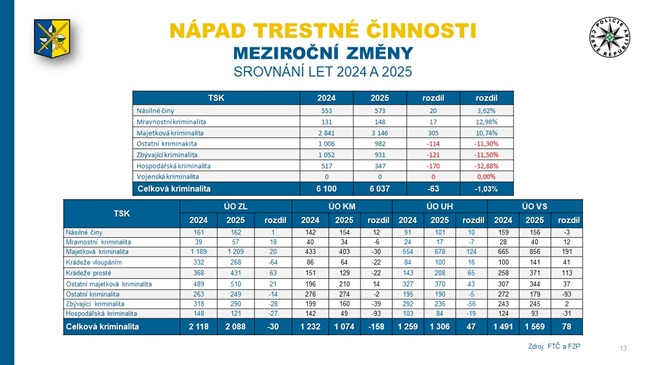 Celková kriminalita na území republiky meziročně klesla o 1,9 %. Policie evidovala 170 051 trestných činů, z toho 6 037 ve Zlínském kraji. Policisté v regionu přitom objasnili 56,53 % všech trestných činů. „Tento výsledek potvrzuje stabilně kvalitní práci policistů v regionu a jejich schopnost efektivně reagovat na trestnou činnost,“ hodnotí policejní mluvčí Šárka Trnková.