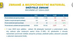 Držitelů zbrojních průkazů bylo loni evidováno 17 659, o 161 více než v předchozím roce. Policisté provedli 335 kontrol a řešili 58 přestupků, nejčastěji kvůli opožděným zdravotním posudkům.