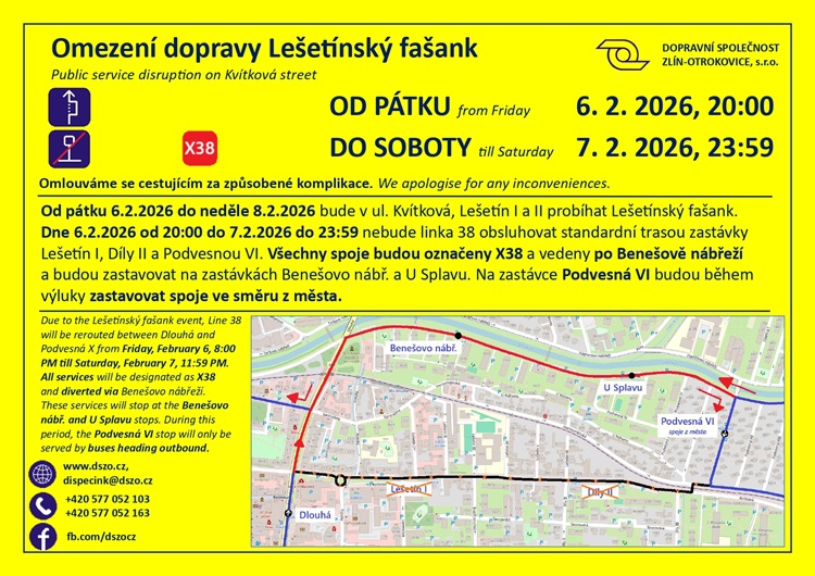 Výluka začne v pátek ve 20 hodin a potrvá do sobotní půlnoci. „V tomto termínu bude linka 38 vynechávat zastávky Podvesná VI a to ve směru do centra, a v obou směrech zastávky Díly II a Lešetín I,“ upozornil Martin Slačálek, technik jízdních řádů DSZO.