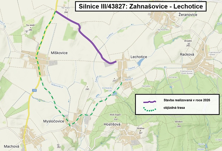 Stavební práce proběhnou za úplné uzavírky. Objízdná trasa povede v obou směrech přes Míškovice, Mysločovice a Lechotice.