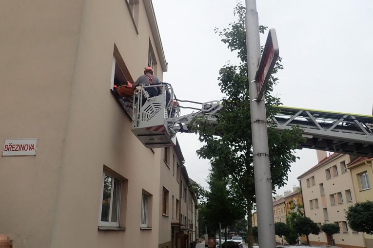 Zraněného seniora museli hasiči z bytu dostat výškovou technikou