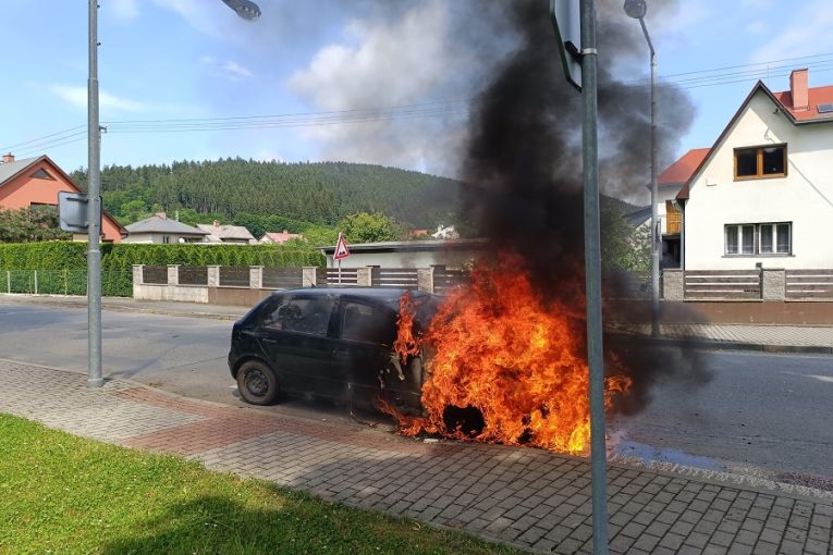 U Vsetína narazilo auto do sloupu a začalo hořet