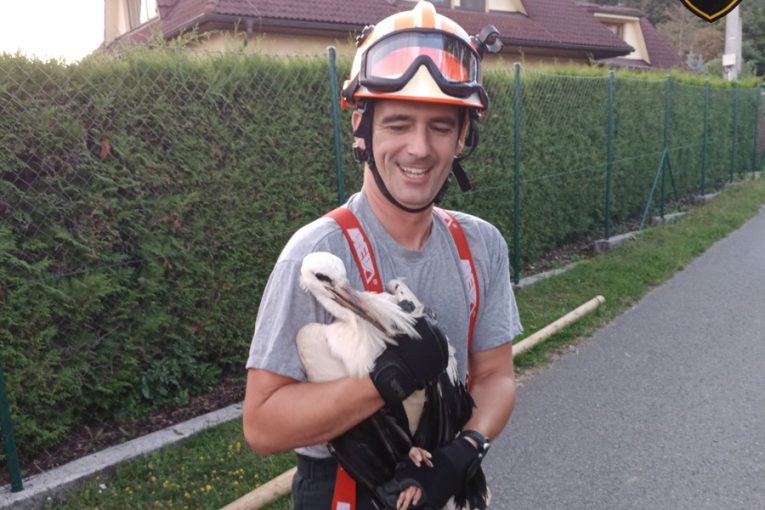 Čapí mládě se nemohlo vrátit do hnízda. Na pomoc mu přispěchali hasiči